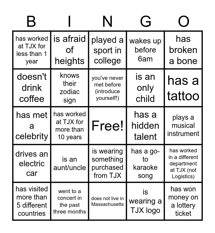 This bingo card has a free space and 29 words: has visited more than 5 different countries, speaks more than 1 language, has worked at TJX for more than 10 years, has been on a cruise, has worked at TJX for less than 1 year, played a sport in college, knows their zodiac sign, is an aunt/uncle, has a hidden talent, went to a concert in the past three months, plays a musical instrument, has won money on a lottery ticket, does not live in Massachusetts, is wearing a TJX logo, has a tattoo, has a pet cat, is wearing something purchased from TJX, drives an electric car, has broken a bone, has met a celebrity, has a go-to karaoke song, follows college sports, is an only child, doesn't drink coffee, wakes up before 6am, is afraid of heights, has worked in a different department at TJX (not Logistics), you've never met before (introduce yourself!) and was born on Friday the 13th.