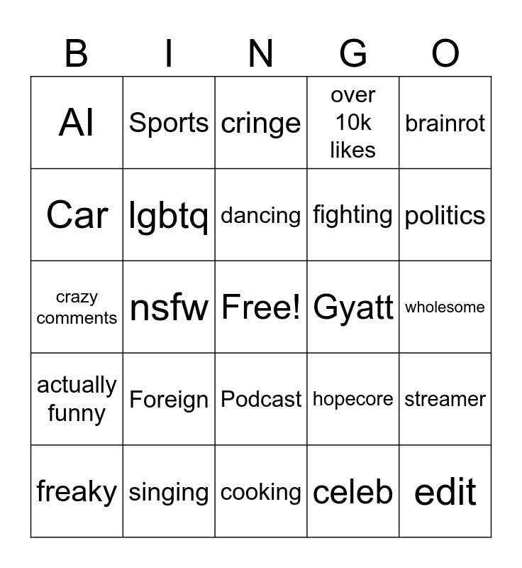This bingo card has a free space and 24 words: Foreign, singing, dancing, freaky, brainrot, AI, Car, Sports, Gyatt, Podcast, fighting, crazy comments, hopecore, streamer, lgbtq, celeb, wholesome, cringe, politics, nsfw, edit, actually funny, over 10k likes and cooking.