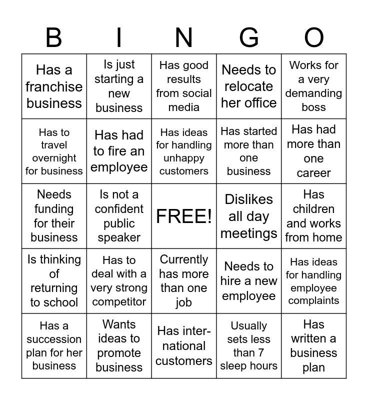 This bingo card has a free space and 24 words: Has to deal with a very strong competitor, Wants ideas to promote business, Has ideas for handling unhappy customers, Has a succession plan for her business, Works for a very demanding boss, Has a franchise business, Has to travel overnight for business, Is just starting a new business, Dislikes all day meetings, Currently has more than one job, Has started more than one business, Needs funding for their business, Needs to hire a new employee, Has ideas for handling employee complaints, Has had to fire an employee, Usually sets less than 7 sleep hours, Has children and works from home, Has good results from social media, Has had more than one career, Is not a confident public speaker, Has written a business plan, Is thinking of returning to school, Needs to relocate her office and Has inter- national customers.