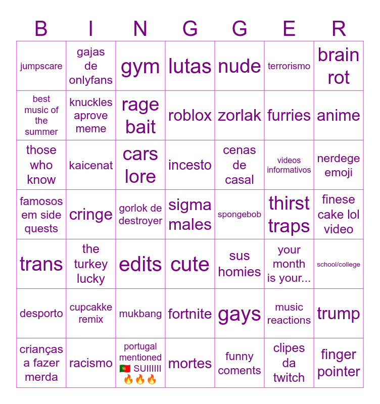 This bingo card has a free space and 48 words: gays, furries, mortes, cringe, cars lore, finese cake lol video, gajas de onlyfans, racismo, terrorismo, cute, brain rot, lutas, videos informativos, cenas de casal, desporto, thirst traps, best music of the summer, anime, music reactions, nude, zorlak, gorlok de destroyer, jumpscare, knuckles aprove meme, trump, rage bait, nerdege emoji, crianças a fazer merda, incesto, kaicenat, clipes da twitch, spongebob, school/college, cupcakke remix, famosos em side quests, sus homies, your month is your..., those who know, edits, mukbang, trans, finger pointer, gym, portugal mentioned🇵🇹 SUIIIIII🔥🔥🔥, roblox, fortnite, the turkey lucky and funny coments.