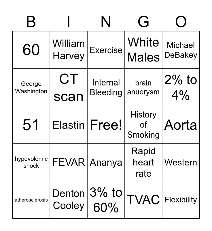 This bingo card has a free space and 36 words: Doppler Ultrasound, EVAR, Healthy Diet, CT scan, Rapid heart rate, hypovolemic shock, Internal Bleeding, smoking, Michael DeBakey, x-ray, Elastin, White Males, Aneurism, History of Smoking, 2% to 4%, 60, cash, FEVAR, Flexibility, Exercise, Aorta, Western, Denton Cooley, atherosclerosis, 3% to 60%, William Harvey, 51, Watson and Crick, brain anuerysm, George Washington, Africa, Don't Exercise, TVAC, Ananya, Collagen and MRI.