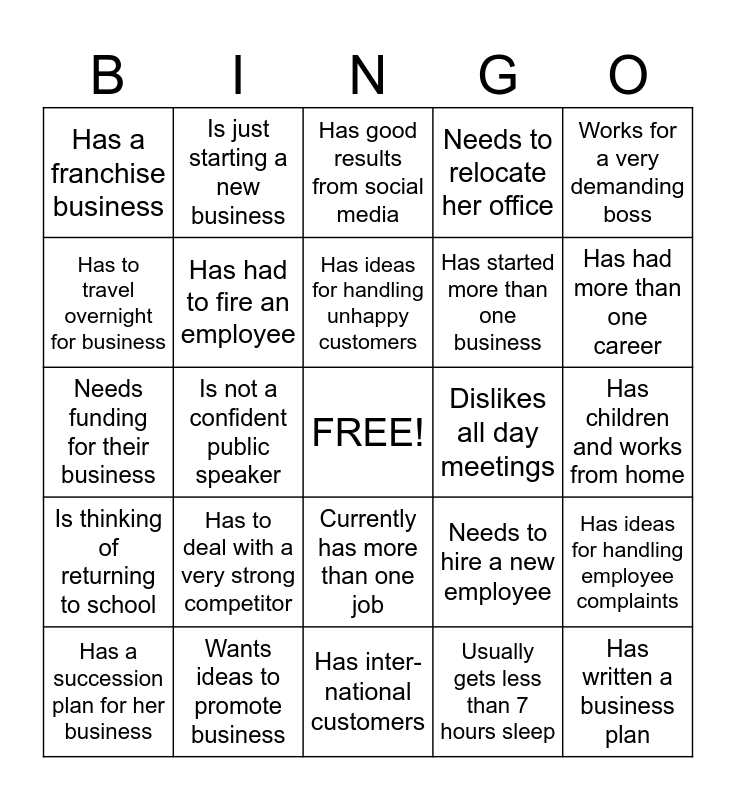 This bingo card has a free space and 24 words: Has to deal with a very strong competitor, Wants ideas to promote business, Has ideas for handling unhappy customers, Has a succession plan for her business, Works for a very demanding boss, Has a franchise business, Has to travel overnight for business, Is just starting a new business, Dislikes all day meetings, Currently has more than one job, Has started more than one business, Needs funding for their business, Needs to hire a new employee, Has ideas for handling employee complaints, Has had to fire an employee, Usually gets less than 7 hours sleep, Has children and works from home, Has good results from social media, Has had more than one career, Is not a confident public speaker, Has written a business plan, Is thinking of returning to school, Needs to relocate her office and Has inter- national customers.