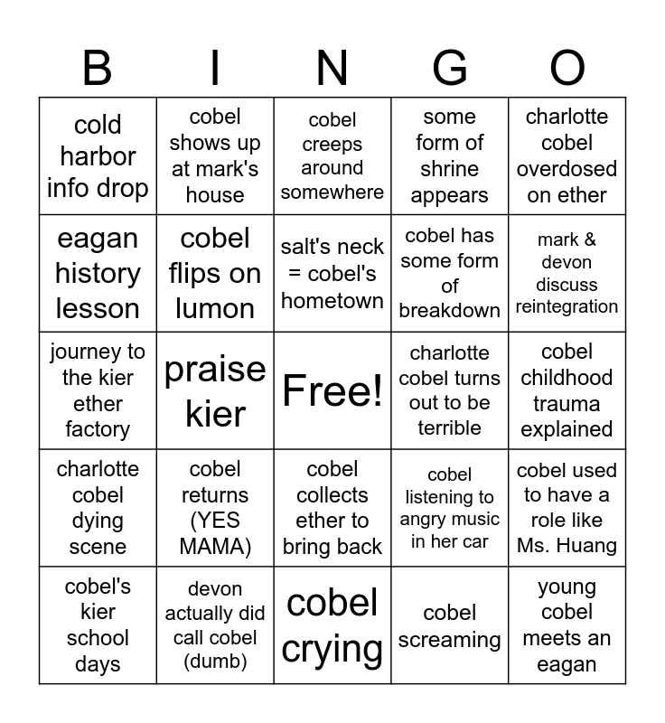 This bingo card has a free space and 24 words: cobel returns (YES MAMA), devon actually did call cobel (dumb), salt's neck = cobel's hometown, cobel's kier school days, charlotte cobel overdosed on ether, cold harbor info drop, eagan history lesson, cobel shows up at mark's house, charlotte cobel turns out to be terrible, cobel collects ether to bring back, cobel has some form of breakdown, journey to the kier ether factory, cobel listening to angry music in her car, cobel used to have a role like Ms. Huang, cobel flips on lumon, cobel screaming, cobel childhood trauma explained, cobel creeps around somewhere, mark & devon discuss reintegration, praise kier, young cobel meets an eagan, charlotte cobel dying scene, some form of shrine appears and cobel crying.