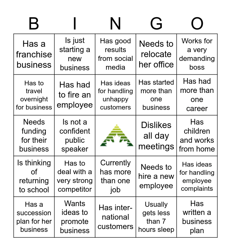 This bingo card has a free space and 24 words: Has to deal with a very strong competitor, Wants ideas to promote business, Has ideas for handling unhappy customers, Has a succession plan for her business, Works for a very demanding boss, Has a franchise business, Has to travel overnight for business, Is just starting a new business, Dislikes all day meetings, Currently has more than one job, Has started more than one business, Needs funding for their business, Needs to hire a new employee, Has ideas for handling employee complaints, Has had to fire an employee, Usually gets less than 7 hours sleep, Has children and works from home, Has good results from social media, Has had more than one career, Is not a confident public speaker, Has written a business plan, Is thinking of returning to school, Needs to relocate her office and Has inter- national customers.