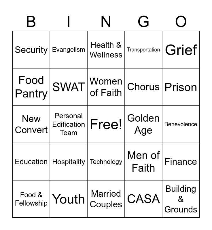 This bingo card has a free space and 24 words: Hospitality, Youth, Women of Faith, Food & Fellowship, Grief, Security, Food Pantry, Evangelism, Golden Age, Technology, Chorus, New Convert, Men of Faith, Finance, SWAT, CASA, Benevolence, Health & Wellness, Prison, Personal Edification Team, Building & Grounds, Education, Transportation and Married Couples.