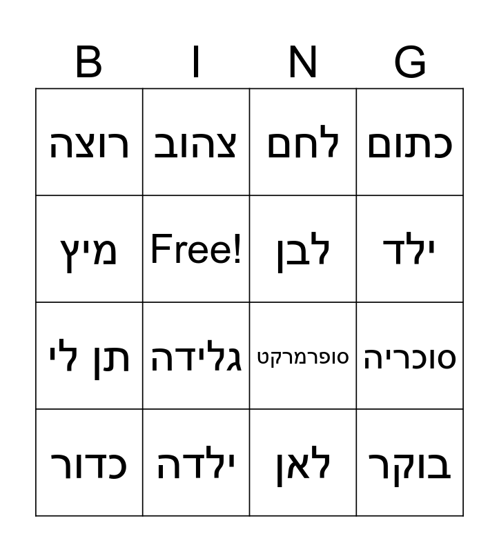 This bingo card has 51 words: גיטרה, כדור, אופנים, שעון, משקפיים, שום דבר, צהוב, אדום, Free!, שחור, לבן, כתום, חום, תכלת, סגול, אפור, ילד, ילדה, בקבוק, מיץ, סוכריה, בבקשה, רוצה, תן לי, שוקולד, מים, גלידה, קופסא, חלב, לחם, עוד, מספיק, מסיבה, חנות, בית-ספר, עבודה, הולך, הולכת, רץ, רצה, לאן, בוקר, צהריים, אחרי-צהריים, ערב, לילה, סופרמרקט, עוגה, ממתקים, קונה and שמח.