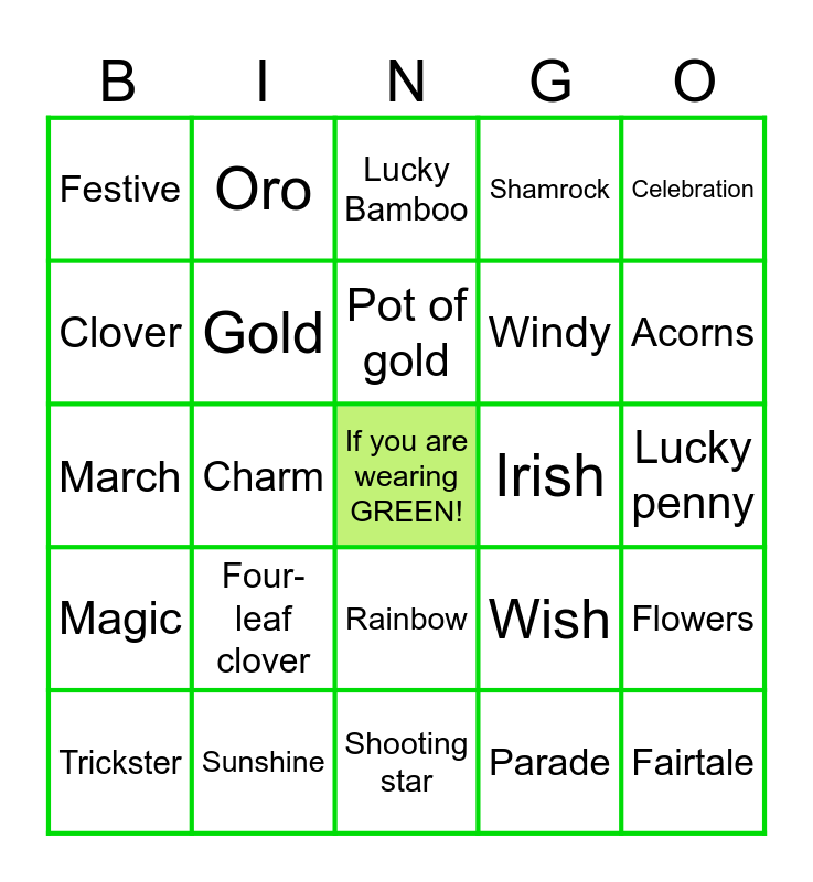 This bingo card has a free space and 35 words: Lucky, Ireland, Green, Gold, Rainbow, Shamrock, Clover, Leprechaun, Pot of gold, Horseshoe, March, Celebration, Emerald, Treasure, Festive, Irish, Parade, Charm, Magic, Fairtale, Wish, Trickster, Flowers, Sunshine, Lucky Bamboo, Acorns, Suerte, Puddle, Windy, Lucky penny, Rabbit’s foot, Shooting star, Four-leaf clover, Oro and Verde.