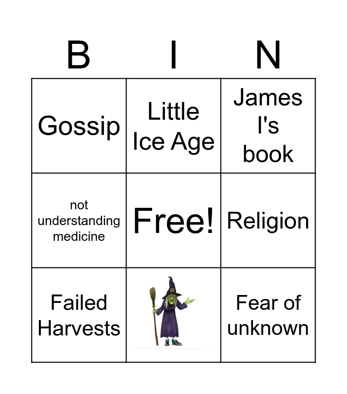 This bingo card has 1 images, a free space and 7 words: Religion, James I's book, Little Ice Age, Failed Harvests, Gossip, Fear of unknown and not understanding medicine.