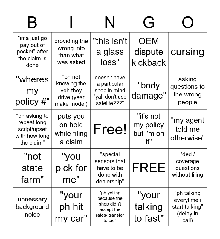 This bingo card has a free space and 25 words: "you pick for me", "ph yelling because the shop didn't accept the rates/ transfer to bid", doesn't have a particular shop in mind "yall don't use safelite???", unnessary background noise, cursing, "ima just go pay out of pocket" after the claim is done, "wheres my policy #", providing the wrong info than what was asked, "it's not my policy but i'm on it", "special sensors that have to be done with dealership", "body damage", "ph asking to repeat long script/upset with how long the claim", FREE, "ded / coverage questions without filing ", "ph not knowing the veh they drive (year make model), "not having dol (ph only)", "my agent told me otherwise", "this isn't a glass loss", asking questions to the wrong people, puts you on hold while filing a claim, "ph talking everytime i start talking"(delay in call), "your ph hit my car", "not state farm", OEM dispute kickback and "your talking to fast".