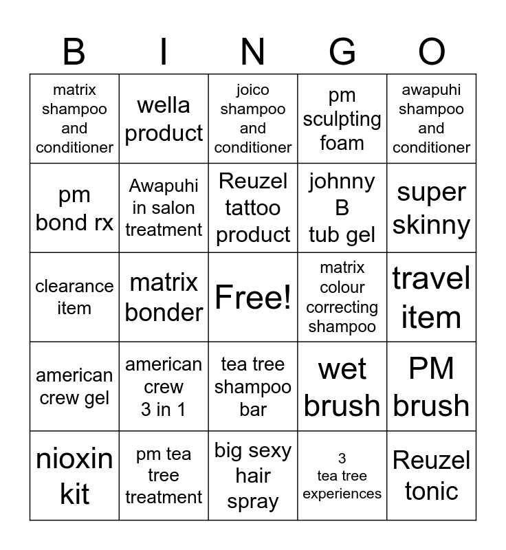 This bingo card has a free space and 24 words: american crew 3 in 1, pm tea tree treatment, Reuzel tattoo product, nioxin kit, awapuhi shampoo and conditioner, matrix shampoo and conditioner, pm bond rx, wella product, matrix colour correcting shampoo, tea tree shampoo bar, johnny B tub gel, clearance item, wet brush, PM brush, Awapuhi in salon treatment, 3 tea tree experiences, travel item, joico shampoo and conditioner, super skinny, matrix bonder, Reuzel tonic, american crew gel, pm sculpting foam and big sexy hair spray.