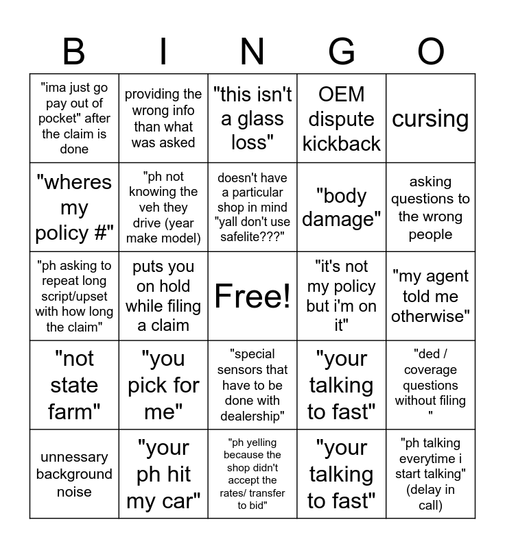 This bingo card has a free space and 25 words: "you pick for me", "ph yelling because the shop didn't accept the rates/ transfer to bid", doesn't have a particular shop in mind "yall don't use safelite???", unnessary background noise, cursing, "ima just go pay out of pocket" after the claim is done, "wheres my policy #", providing the wrong info than what was asked, "it's not my policy but i'm on it", "special sensors that have to be done with dealership", "body damage", "ph asking to repeat long script/upset with how long the claim", "your talking to fast", "ded / coverage questions without filing ", "ph not knowing the veh they drive (year make model), "not having dol (ph only)", "my agent told me otherwise", "this isn't a glass loss", asking questions to the wrong people, puts you on hold while filing a claim, "ph talking everytime i start talking"(delay in call), "your ph hit my car", "not state farm", OEM dispute kickback and "your talking to fast".