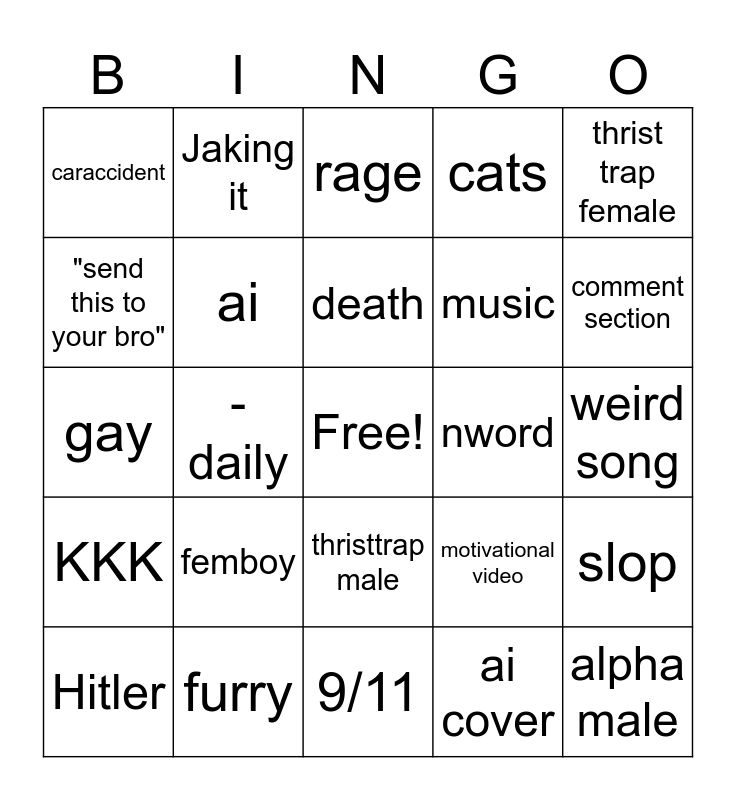 This bingo card has a free space and 24 words: femboy, furry, death, Hitler, thrist trap female, caraccident, "send this to your bro", Jaking it, nword, thristtrap male, music, gay, motivational video, slop, ai, ai cover, weird song, rage, comment section, -daily, alpha male, KKK, cats and 9/11.