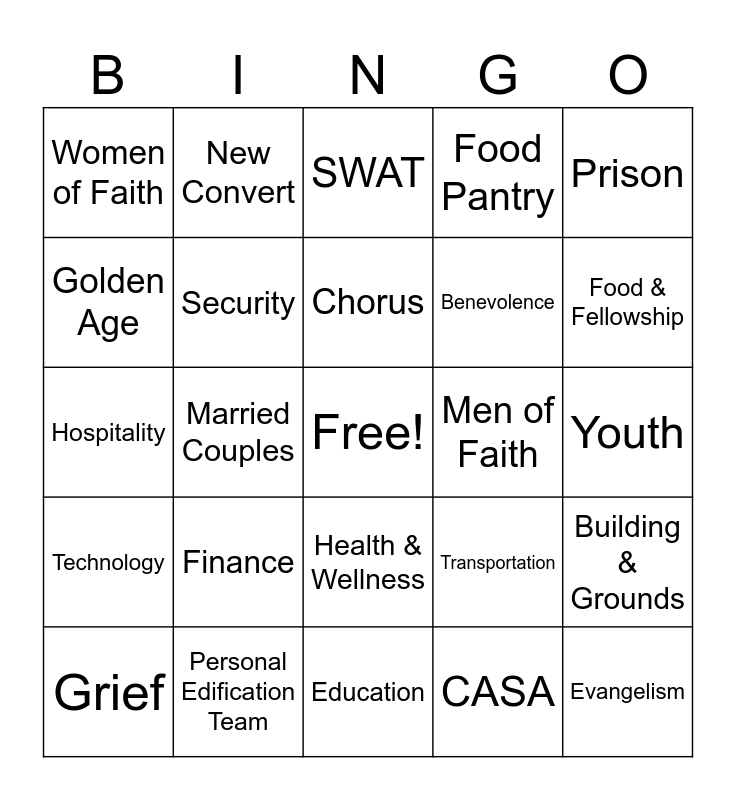 This bingo card has a free space and 24 words: Finance, Personal Edification Team, Chorus, Grief, Prison, Women of Faith, Golden Age, New Convert, Men of Faith, Health & Wellness, Benevolence, Hospitality, Transportation, Building & Grounds, Security, CASA, Youth, SWAT, Food & Fellowship, Married Couples, Evangelism, Technology, Food Pantry and Education.