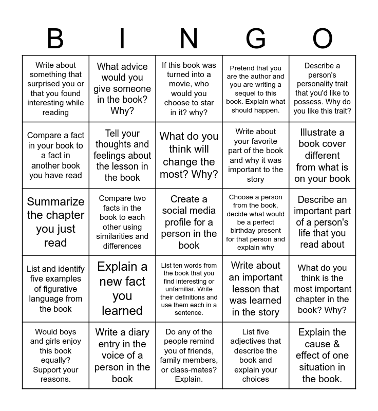 This bingo card has a free space and 24 words: Explain a new fact you learned, Write a diary entry in the voice of a person in the book, What do you think will change the most? Why?, Would boys and girls enjoy this book equally? Support your reasons., Describe a person's personality trait that you'd like to possess. Why do you like this trait?, Write about something that surprised you or that you found interesting while reading, Compare a fact in your book to a fact in another book you have read, What advice would you give someone in the book? Why?, Choose a person from the book, decide what would be a perfect birthday present for that person and explain why, List ten words from the book that you find interesting or unfamiliar. Write their definitions and use them each in a sentence., Write about your favorite part of the book and why it was important to the story, Summarize the chapter you just read, Write about an important lesson that was learned in the story, What do you think is the most important chapter in the book? Why?, Tell your thoughts and feelings about the lesson in the book, List five adjectives that describe the book and explain your choices, Describe an important part of a person's life that you read about, If this book was turned into a movie, who would you choose to star in it? why?, Illustrate a book cover different from what is on your book, Compare two facts in the book to each other using similarities and differences, Explain the cause & effect of one situation in the book., List and identify five examples of figurative language from the book, Pretend that you are the author and you are writing a sequel to this book. Explain what should happen. and Do any of the people remind you of friends, family members, or class-mates? Explain..