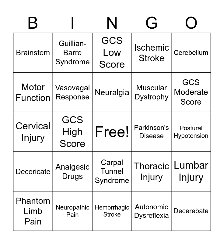 This bingo card has a free space and 24 words: Analgesic Drugs, Neuropathic Pain, Neuralgia, Phantom Limb Pain, Cerebellum, Brainstem, Motor Function, Guillian-Barre Syndrome, Parkinson's Disease, Carpal Tunnel Syndrome, Muscular Dystrophy, Cervical Injury, Thoracic Injury, Lumbar Injury, Vasovagal Response, Autonomic Dysreflexia, Postural Hypotension, GCS Low Score, GCS Moderate Score, GCS High Score, Decerebate, Decoricate, Ischemic Stroke and Hemorrhagic Stroke.