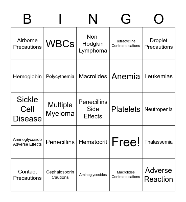 This bingo card has 25 words: Penecillins, Aminoglycosides, Macrolides, Contact Precautions, Droplet Precautions, Airborne Precautions, Hemoglobin, WBCs, Platelets, Hematocrit, Anemia, Sickle Cell Disease, Free!, Thalassemia, Polycythemia, Adverse Reaction, Neutropenia, Non-Hodgkin Lymphoma, Leukemias, Multiple Myeloma, Penecillins Side Effects, Cephalosporin Cautions, Aminoglycoside Adverse Effects, Tetracycline Contraindications and Macrolides Contraindications.