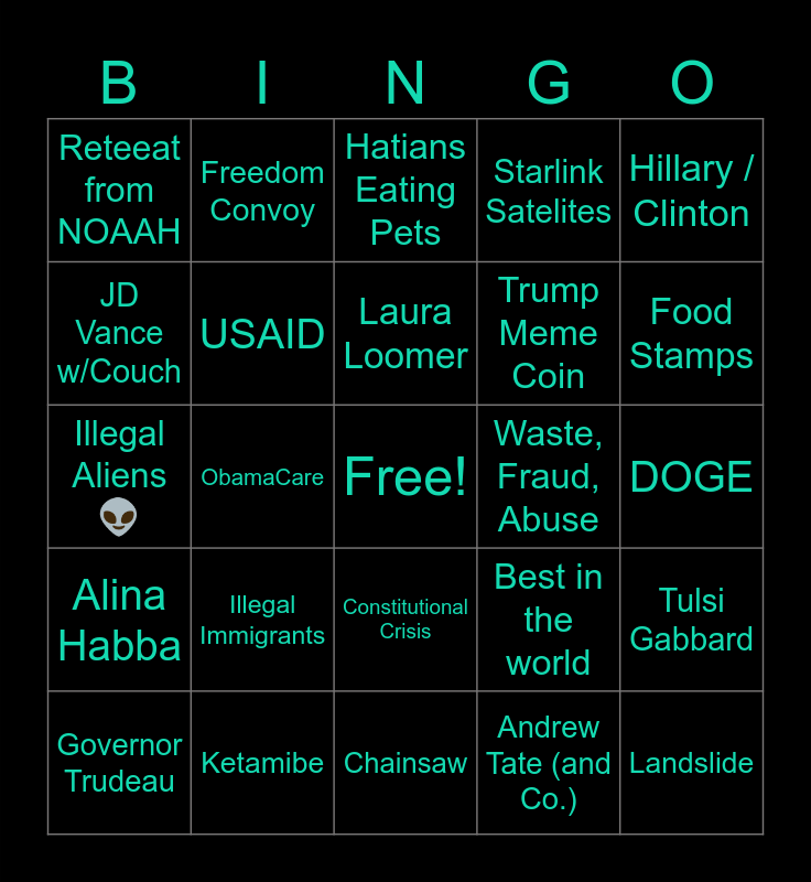 This bingo card has a free space and 164 words: Sleepy Joe, Biden's Fault, Obama, Obamna, Trump Gaza Hotel, Zelinsky Dictator, Putin Good/Great Guy/Man, Accordion Hands, Condoms for Hamas, JD Vance, JD Vance w/Couch, Ski Vacation Vermont, Hatians Eating Pets, Paid (Democratic) Actors, Best in the world, Greatest Economy, DEI Hire/s, Trans People, Poorly Educated, Christian, Pronouns, Mexican Cartels in Canada, Tariffs, Canada, Drug Trafficking, Immigrants, Taking Our Jobs, Fentanyl, Drugs, The Border, Witch Hunt, Hillary's / Emails, Hillary / Clinton, Hoax, Hunter's Laptop, Gas Prices, ICE, Golf, Maralago, Town Halls, Free Speech, Marxist/s-Fascist/s, Communist/s, Radical, Radical Left, Huge, The Best, Women, America, MAGA, Gulf of America, Associated Press, Fox News, Reuters, Panama Canal, Greenland, Taking Over, DOGE, Elon Musk, 34 Felonies, Andrew Tate (and Co.), Jan. 6th Choir, Food Stamps, SNAP, Mexicans, Illegal Immigrants, Steve Bannon, Marjorie Taylor Green, Mitch McConnell, Greatest in the World, Bitcoin, Trump Meme Coin, Melania Meme Coin, Trump Gold Visa, Trump Sneakers, Trump Guitar, Marco Rubio, Jim Jordan, Mike Johnson, Pete Hegseth, Caroline Levitt, Laura Loomer, Ivanka Trump, Jared Kushner, Baron Trump, Don Jr., Eric Trump, Melania, Tulsi Gabbard, Alina Habba, Proud Boys, Pam Bondi, Peter Navarro, Joe Rogan, Clarence Thomas, Dan Bongino, USAID, Ebola, Bird Flu, Measles / MMR, Ruby Red States, Landslide, Done in 1 Day, Eating the Dogs, Candice Owens, Gays, Kash Patel, Governor Trudeau, Illegal Aliens 👽, Truth Social, Truth Central, Denmark, Trade War, Oil, Drill Baby Drill, Fight Fight Fight, Assassination Attempt #1, Assassination Attempt #2, YMCA, Guns, Chainsaw, Elon Meme, Elon Salute, Ketamibe, Say Thank You Zelinsky!, Where's Your Suit Zelinsky?, Elon's Child Shield 🛡, Reteeat from NOAAH, Retreat from W.H.O., Anti-Vax, Constitutional Crisis, Free Speech Persecution, MAGA Hats, Freedom Convoy, Jan. 6th 2021 Insurrection, "Peaceful Protest", "Don't Hold Town Halls", Billionaires, Social Security Raid, BigBalls, Tesla/s, Cybertruck/s, Swasticars, Eliminating Taxes On Tips, Affordable Care Act, ObamaCare, MedicAID, Flooding The Gates, Waste, Fraud, Abuse, President Elon, Vivek Ramaswamy, 100-300yr old Social Security Receivers, Manosphere, Incels, Romania, Starlink Satelites, Starlink, Jeff Bezos, Blue Origin, Katy Perry, FAA, Plane Crash/es, Israel and Hamas.
