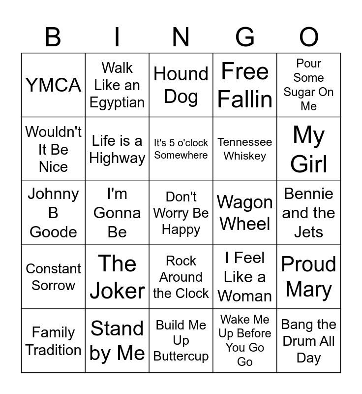 This bingo card has 25 words: The Joker, Build Me Up Buttercup, It's 5 o'clock Somewhere, Family Tradition, Pour Some Sugar On Me, YMCA, Wouldn't It Be Nice, Walk Like an Egyptian, Wagon Wheel, Rock Around the Clock, Tennessee Whiskey, Johnny B Goode, I Feel Like a Woman, Proud Mary, Life is a Highway, Bang the Drum All Day, Bennie and the Jets, Hound Dog, My Girl, I'm Gonna Be, Don't Worry Be Happy, Stand by Me, Constant Sorrow, Free Fallin and Wake Me Up Before You Go Go.