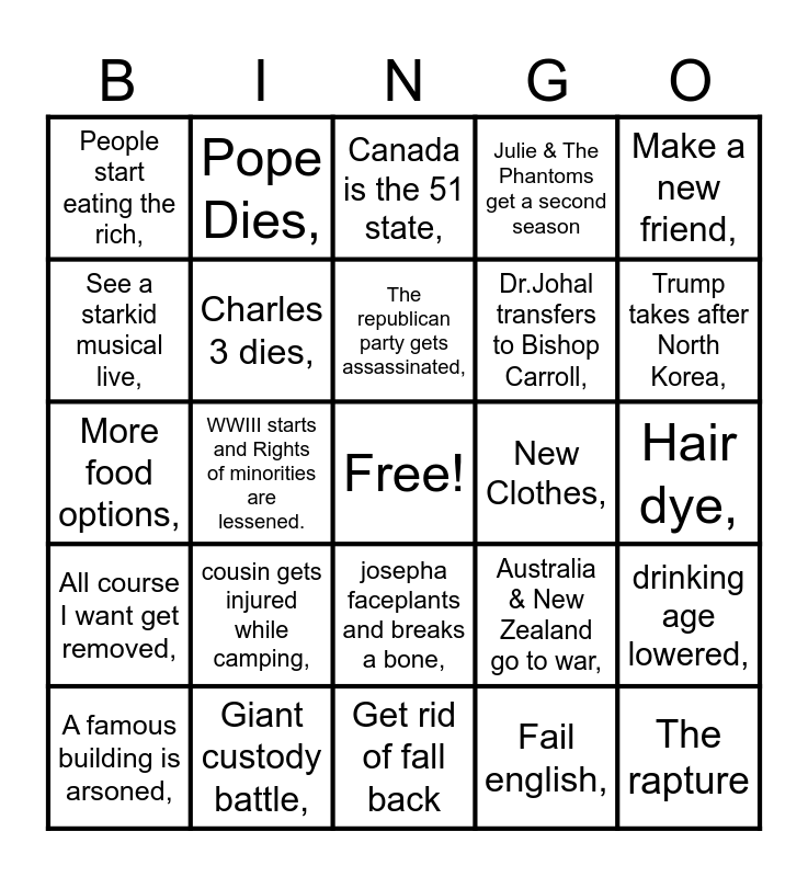 This bingo card has a free space and 24 words: cousin gets injured while camping,, Giant custody battle,, The republican party gets assassinated,, A famous building is arsoned,, Make a new friend,, People start eating the rich,, See a starkid musical live,, Pope Dies,, New Clothes,, josepha faceplants and breaks a bone,, Dr.Johal transfers to Bishop Carroll,, More food options,, Australia & New Zealand go to war,, drinking age lowered,, Charles 3 dies,, Fail english,, Hair dye,, Canada is the 51 state,, Trump takes after North Korea,, WWIII starts and Rights of minorities are lessened., The rapture, All course I want get removed,, Julie & The Phantoms get a second season and Get rid of fall back.