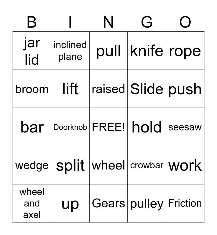 This bingo card has a free space and 34 words: screw, pulley, thread, lever, wedge, lift, rope, wheel and axel, inclined plane, fulcrum, raised, pull, pole, ladder, hold, push, up, bar, split, crowbar, wheel, flag pole, jar lid, seesaw, Gears, Friction, knife, door stop, Slide, broom, cable, Doorknob, work and Ramp.