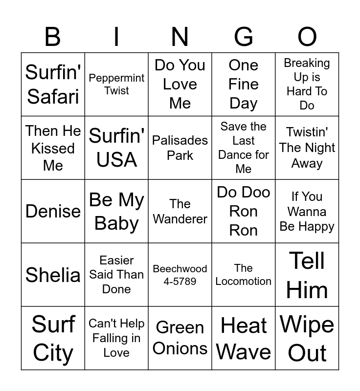 This bingo card has 25 words: Easier Said Than Done, Green Onions, Palisades Park, Surf City, Breaking Up is Hard To Do, Surfin' Safari, Then He Kissed Me, Peppermint Twist, Do Doo Ron Ron, Beechwood 4-5789, Save the Last Dance for Me, Denise, The Locomotion, Tell Him, Surfin' USA, Wipe Out, If You Wanna Be Happy, Do You Love Me, Twistin' The Night Away, Be My Baby, The Wanderer, Can't Help Falling in Love, Shelia, One Fine Day and Heat Wave.