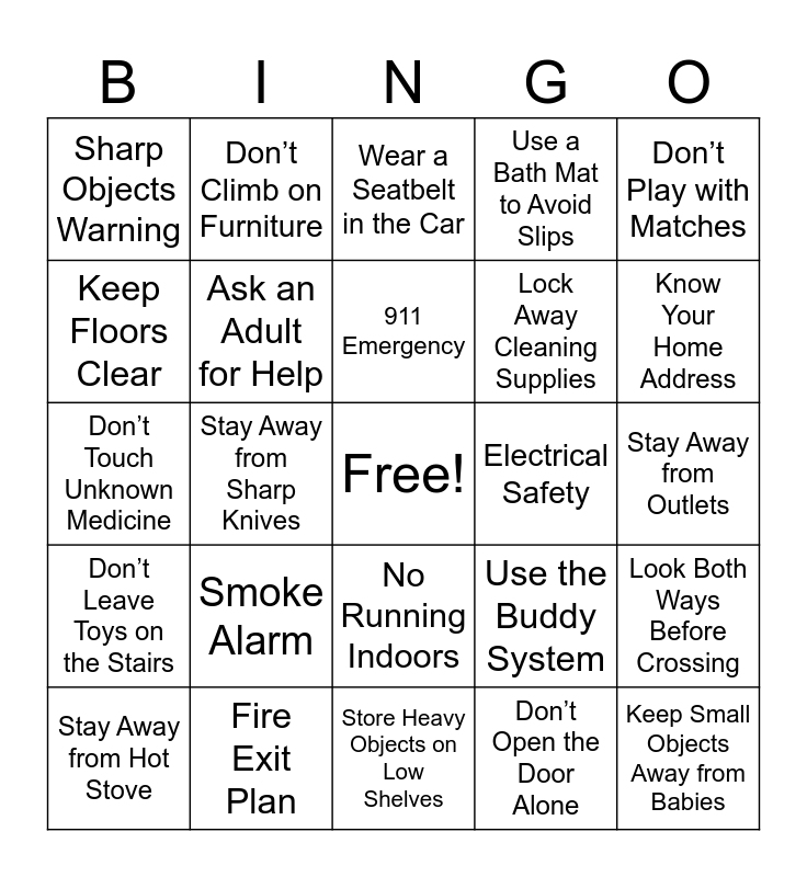 This bingo card has a free space and 24 words: Smoke Alarm, Fire Exit Plan, 911 Emergency, Stay Away from Hot Stove, Don’t Play with Matches, Sharp Objects Warning, Keep Floors Clear, Don’t Climb on Furniture, Electrical Safety, No Running Indoors, Lock Away Cleaning Supplies, Don’t Touch Unknown Medicine, Use the Buddy System, Look Both Ways Before Crossing, Ask an Adult for Help, Don’t Open the Door Alone, Stay Away from Outlets, Wear a Seatbelt in the Car, Know Your Home Address, Stay Away from Sharp Knives, Keep Small Objects Away from Babies, Don’t Leave Toys on the Stairs, Use a Bath Mat to Avoid Slips and Store Heavy Objects on Low Shelves.