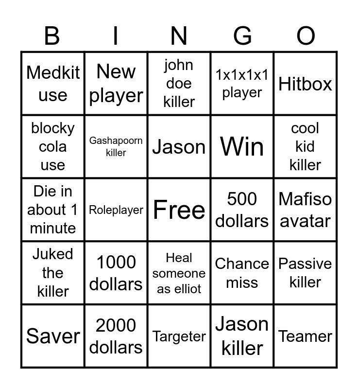 This bingo card has a free space and 24 words: 1000 dollars, 2000 dollars, Jason, Saver, Hitbox, Medkit use, blocky cola use, New player, 500 dollars, Heal someone as elliot, Win, Die in about 1 minute, Chance miss, Passive killer, Gashapoorn killer, Jason killer, Mafiso avatar, john doe killer, cool kid killer, Roleplayer, Teamer, Juked the killer, 1x1x1x1 player and Targeter.