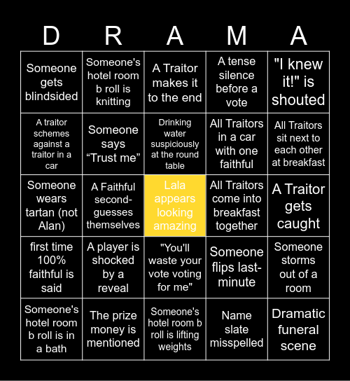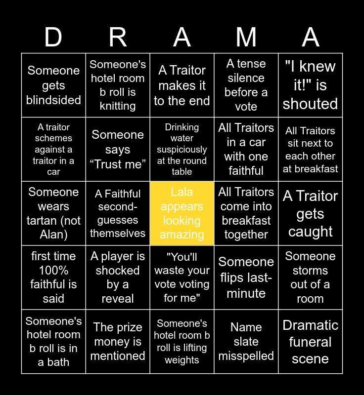 This bingo card has a free space and 36 words: A player cries, A Traitor throws an ally under the bus, "We have to stick together" is said, Someone says “Trust me”, Someone flips last-minute, first time 100% faithful is said, Drinking water suspiciously at the round table, Emotional breakdown at round table including tears, "I knew it!" is shouted, "This is so stressful" is said, A Faithful second-guesses themselves, A tense silence before a vote, A Faithful cosies up to a correctly identified traitor, All Traitors come into breakfast together, All Traitors sit next to each other at breakfast, Someone gets blindsided, A note or letter is read aloud, A player is shocked by a reveal, Dramatic funeral scene, A Traitor makes it to the end, A Traitor gets caught, Someone storms out of a room, The prize money is mentioned, Someone's hotel room b roll is in a bath, Someone's hotel room b roll is lifting weights, Someone's hotel room b roll is knitting, Someone wears tartan (not Alan), A previous contestant returns, All Traitors in a car with one faithful, A traitor schemes against a traitor in a car, Creepy carnival themed challenge, Challenge involving insects, Name slate misspelled, "You'll waste your vote voting for me", "We need to look at the quiet people" and Traitor accidently reveals secret info.