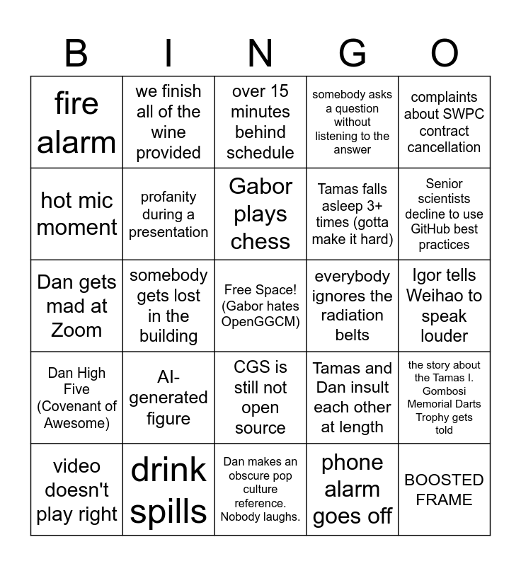 This bingo card has a free space and 24 words: AI-generated figure, drink spills, Gabor plays chess, video doesn't play right, complaints about SWPC contract cancellation, fire alarm, hot mic moment, we finish all of the wine provided, everybody ignores the radiation belts, CGS is still not open source, Tamas falls asleep 3+ times (gotta make it hard), Dan gets mad at Zoom, Tamas and Dan insult each other at length, the story about the Tamas I. Gombosi Memorial Darts Trophy gets told, profanity during a presentation, phone alarm goes off, Igor tells Weihao to speak louder, over 15 minutes behind schedule, Senior scientists decline to use GitHub best practices, somebody gets lost in the building, BOOSTED FRAME, Dan High Five (Covenant of Awesome), somebody asks a question without listening to the answer and Dan makes an obscure pop culture reference. Nobody laughs..