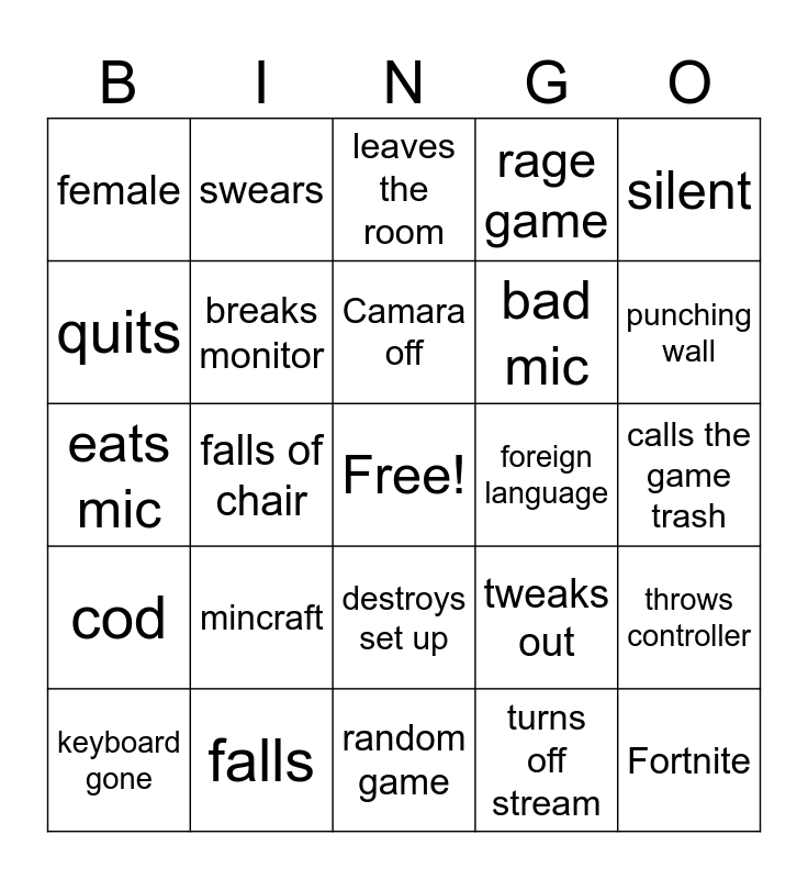 This bingo card has a free space and 24 words: mincraft, falls, Camara off, keyboard gone, silent, female, quits, swears, foreign language, destroys set up, bad mic, eats mic, tweaks out, throws controller, breaks monitor, turns off stream, calls the game trash, leaves the room, punching wall, falls of chair, Fortnite, cod, rage game and random game.