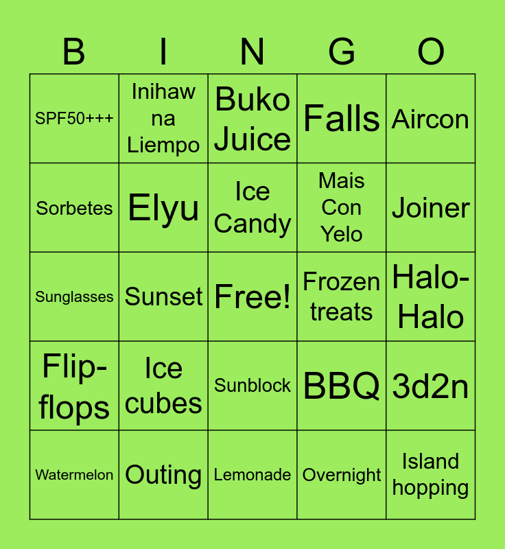 This bingo card has a free space and 24 words: Watermelon, Ice cubes, Ice Candy, Overnight, Aircon, SPF50+++, Inihaw na Liempo, Buko Juice, Frozen treats, Halo-Halo, Sunglasses, Elyu, BBQ, 3d2n, Sorbetes, Outing, Lemonade, Falls, Joiner, Flip-flops, Sunset, Sunblock, Mais Con Yelo and Island hopping.