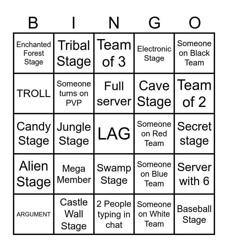 This bingo card has 100 words: Noob, Someone making to the end, Secret stage, Join on White team, Server with no one on Green Team, Server with someone on Yellow Team and Magenta Team, Stage reloading, Someone launching boat, Washing Machine Stage, Someone loading in build, Pro, Gibberish username, Someone lets me on their team, Castle Wall Stage, See a Portal, See someone with a Candy, Cave Stage, See all 4 Starter Stages, The Chillthrill Plushie Room is open, Spam build, Projectile Stage, AFK Farm, Wild West Stage, Someone dies, Circus Stage, Someone on Red Team, Someone on Black Team, Someone on Blue Team, Someone on Green Team, Clock Stage, Jungle Stage, Enchanted Forest Stage, Cherry Blossom Stage, Arcade Stage, Someone on White Team, Full server, Server with 6, Server with 5, Server with 4, Baseball Stage, Bowling Stage, Cinema Stage, Candy Stage, Dojo Stage, Team of 2, Team of 3, Team of 4, Team of 5, Team of 6, 2 People typing in chat, 3 People typing in chat, 4 People typing in chat, Voice chat player, NEW SERVER, Paint Stage, Mushroom Stage, Music Stage, Tropical Stage, Egyptian Stage, Electronic Stage, I see someone with exclusive item, Bridge AFK Grinder, Username more than 14 characters, Username with Underscore, Username with numbers, Board Game Stage, Coral Stage, Diner Stage, Farm Stage, I make it to the end, Member, Mega Member, Royal Member, Someone leaves, Someone joins, Someone asks to be on my team, Lab Stage, TROLL, 2 stages repeat, Ship Wrecked Stage, I see a wood block, LAG, I see a gold block, Swamp Stage, TOXIC Waste Stage, Tribal Stage, Sunset Stage, NO Diving Stage, Beehive Stage, Alien Stage, Someone with Thrusters, Someone with Jets, I get Gold, ARGUMENT, Someone turns on PVP, Someone starts a race, 2 People Launched, 3 People Launched, 4 People Launched and Someone actually building a boat.