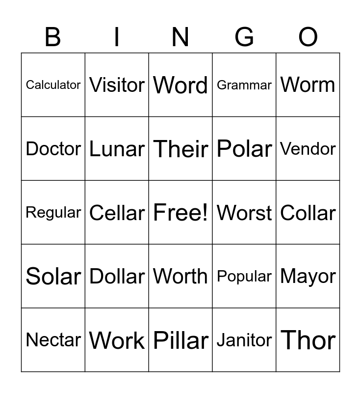 This bingo card has a free space and 24 words: Dollar, Work, Their, Nectar, Worm, Calculator, Doctor, Visitor, Worst, Worth, Polar, Regular, Popular, Mayor, Lunar, Janitor, Collar, Word, Vendor, Cellar, Thor, Solar, Grammar and Pillar.