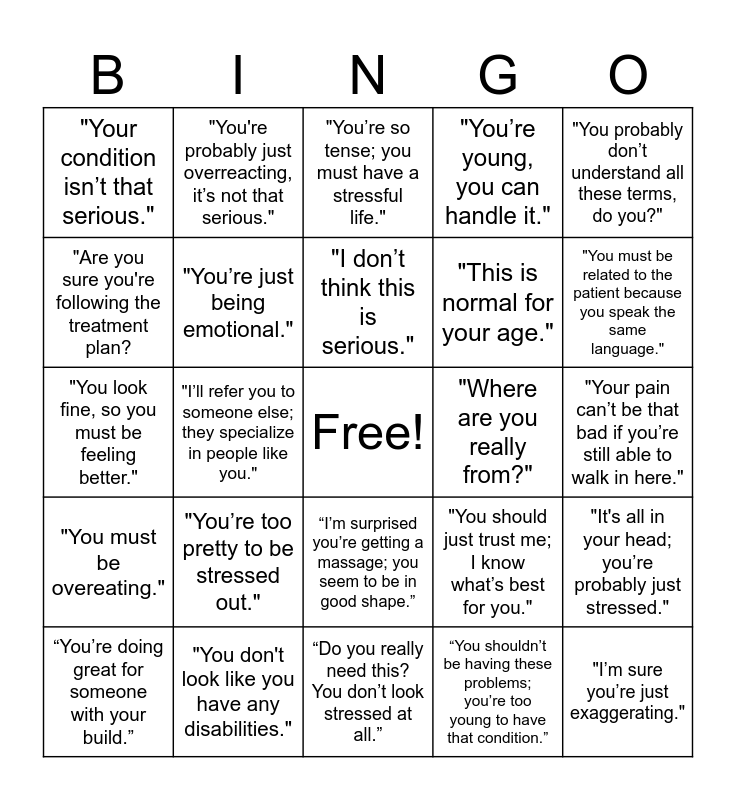 This bingo card has a free space and 24 words: "You’re too pretty to be stressed out.", "You don't look like you have any disabilities.", "I don’t think this is serious.", “You’re doing great for someone with your build.”, "You probably don’t understand all these terms, do you?", "Your condition isn’t that serious.", "Are you sure you're following the treatment plan?, "You're probably just overreacting, it’s not that serious.", "Where are you really from?", “I’m surprised you’re getting a massage; you seem to be in good shape.”, "This is normal for your age.", "You look fine, so you must be feeling better.", "You should just trust me; I know what’s best for you.", "It's all in your head; you’re probably just stressed.", "You’re just being emotional.", “You shouldn’t be having these problems; you’re too young to have that condition.”, "Your pain can’t be that bad if you’re still able to walk in here.", "You’re so tense; you must have a stressful life.", "You must be related to the patient because you speak the same language.", "I’ll refer you to someone else; they specialize in people like you.", "I’m sure you’re just exaggerating.", "You must be overeating.", "You’re young, you can handle it." and “Do you really need this? You don’t look stressed at all.”.