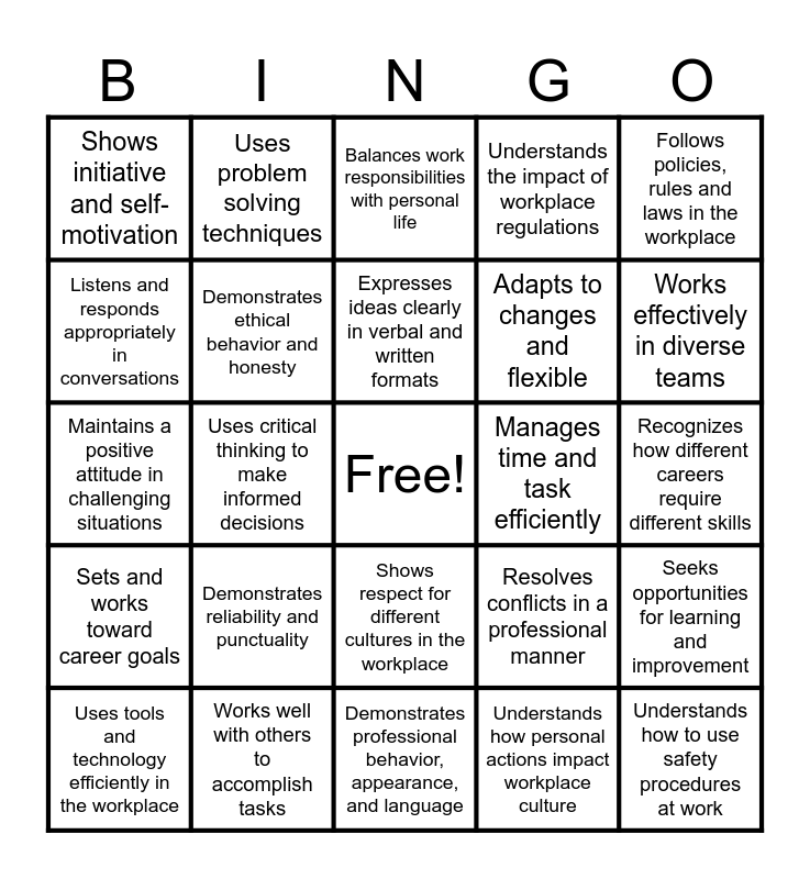 This bingo card has a free space and 24 words: Demonstrates reliability and punctuality, Works well with others to accomplish tasks, Expresses ideas clearly in verbal and written formats, Uses tools and technology efficiently in the workplace, Follows policies, rules and laws in the workplace, Shows initiative and self-motivation, Listens and responds appropriately in conversations, Uses problem solving techniques, Manages time and task efficiently, Shows respect for different cultures in the workplace, Adapts to changes and flexible, Maintains a positive attitude in challenging situations, Resolves conflicts in a professional manner, Seeks opportunities for learning and improvement, Demonstrates ethical behavior and honesty, Understands how personal actions impact workplace culture, Recognizes how different careers require different skills, Balances work responsibilities with personal life, Works effectively in diverse teams, Uses critical thinking to make informed decisions, Understands how to use safety procedures at work, Sets and works toward career goals, Understands the impact of workplace regulations and Demonstrates professional behavior, appearance, and language.