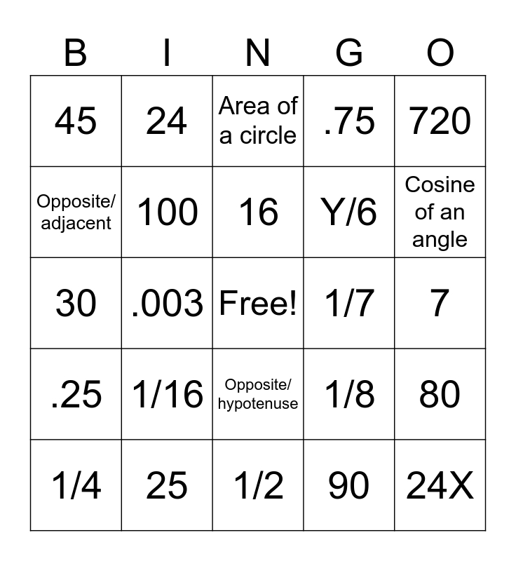This bingo card has a free space and 24 words: 1/4, 1/16, 16, 90, 720, 45, 24, Area of a circle, 1/7, 7, 30, 100, 1/8, 80, Opposite/ adjacent, 25, 1/2, .75, Cosine of an angle, .25, .003, Opposite/ hypotenuse, Y/6 and 24X.