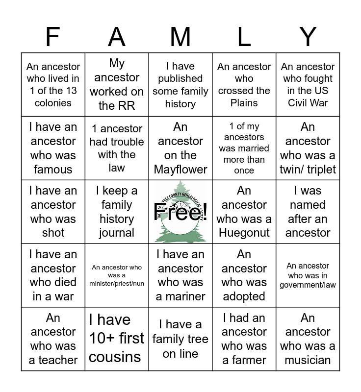 This bingo card has a free space and 24 words: An ancestor who was a minister/priest/nun, I have 10+ first cousins, An ancestor on the Mayflower, An ancestor who was a teacher, An ancestor who fought in the US Civil War, An ancestor who lived in 1 of the 13 colonies, I have an ancestor who was famous, My ancestor worked on the RR, An ancestor who was a Huegonut, I have an ancestor who was a mariner, 1 of my ancestors was married more than once, I have an ancestor who was shot, An ancestor who was adopted, An ancestor who was in government/law, 1 ancestor had trouble with the law, I had an ancestor who was a farmer, I was named after an ancestor, I have published some family history, An ancestor who was a twin/ triplet, I keep a family history journal, An ancestor who was a musician, I have an ancestor who died in a war, An ancestor who crossed the Plains and I have a family tree on line.