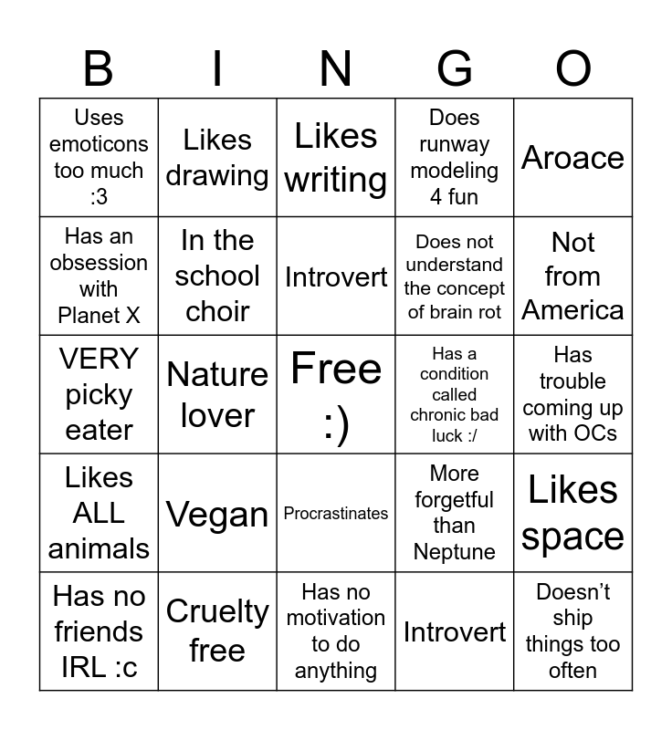 This bingo card has a free space and 24 words: Vegan, Cruelty free, Introvert, Has no friends IRL :c, Aroace, Uses emoticons too much :3, Has an obsession with Planet X, Likes drawing, Has a condition called chronic bad luck :/, Procrastinates, Does not understand the concept of brain rot, VERY picky eater, More forgetful than Neptune, Likes space, In the school choir, Introvert, Has trouble coming up with OCs, Likes writing, Not from America, Nature lover, Doesn’t ship things too often, Likes ALL animals, Does runway modeling 4 fun and Has no motivation to do anything.