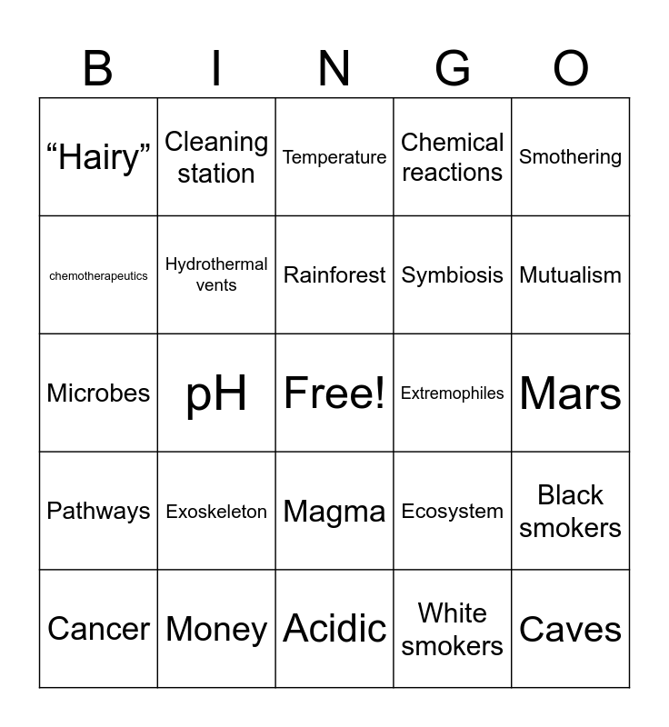 This bingo card has a free space and 24 words: Exoskeleton, Money, Rainforest, Cancer, Smothering, “Hairy”, chemotherapeutics, Cleaning station, Extremophiles, Magma, Symbiosis, Microbes, Ecosystem, Black smokers, Hydrothermal vents, White smokers, Mars, Temperature, Mutualism, pH, Caves, Pathways, Chemical reactions and Acidic.