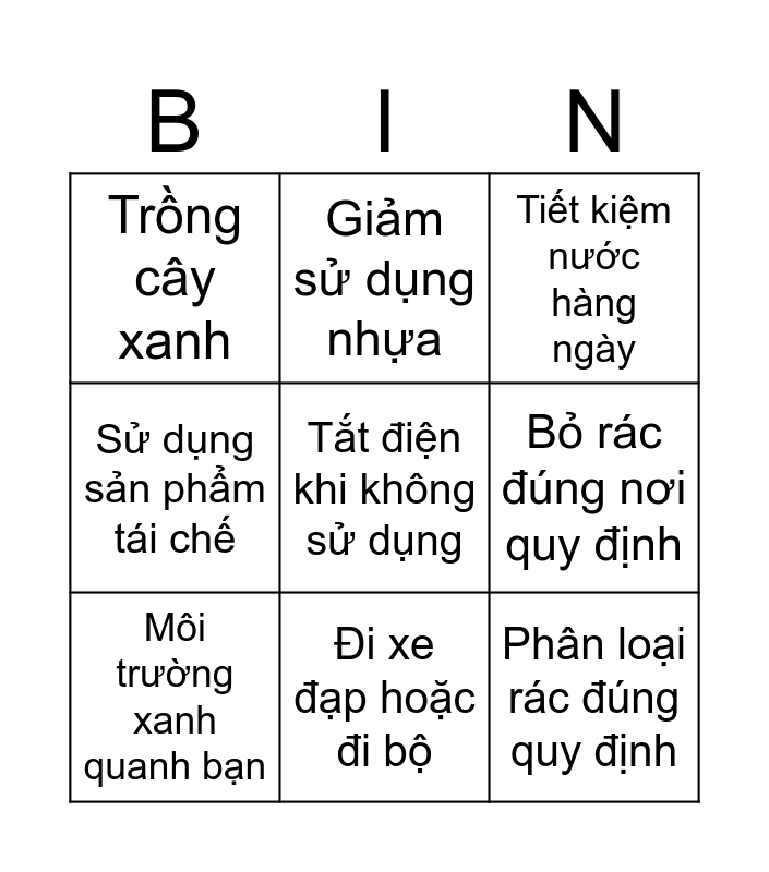 This bingo card has a free space and 8 words: Bỏ rác đúng nơi quy định, Tiết kiệm nước hàng ngày, Giảm sử dụng nhựa, Môi trường xanh quanh bạn, Trồng cây xanh, Phân loại rác đúng quy định, Sử dụng sản phẩm tái chế and Đi xe đạp hoặc đi bộ.