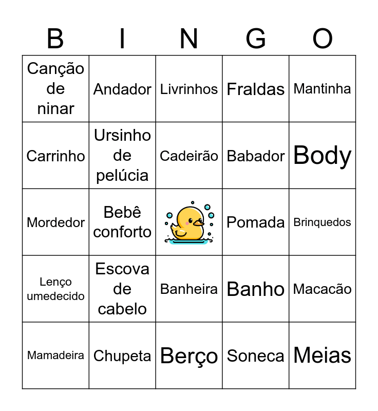 This bingo card has a free space and 24 words: Mamadeira, Escova de cabelo, Cadeirão, Soneca, Mantinha, Canção de ninar, Andador, Livrinhos, Pomada, Brinquedos, Mordedor, Ursinho de pelúcia, Banho, Macacão, Carrinho, Chupeta, Berço, Fraldas, Body, Lenço umedecido, Bebê conforto, Banheira, Babador and Meias.