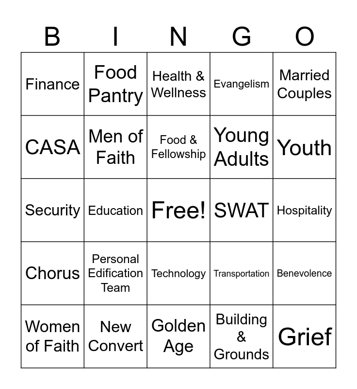 This bingo card has a free space and 24 words: Personal Edification Team, New Convert, Food & Fellowship, Women of Faith, Married Couples, Finance, CASA, Food Pantry, SWAT, Technology, Young Adults, Security, Transportation, Benevolence, Men of Faith, Building & Grounds, Hospitality, Health & Wellness, Youth, Education, Grief, Chorus, Evangelism and Golden Age.