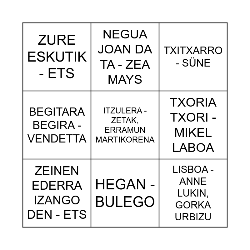 This bingo card has 48 words: BALOREAK, OLE OLENTZERO - ENE KANTAK, SUMENDIAK - ETS, ILARGIA - KEN ZAZPI, ZUREKIN BATERA - ETS, BUELTAN DA - BULEGO, NEGUA JOAN DA TA - ZEA MAYS, ITSASOA GARA - KEN ZAZPI, TXORIA TXORI - MIKEL LABOA, MUSIKAREN DOINUA - ETS, ZEINEN EDERRA IZANGO DEN - ETS, BEGITARA BEGIRA - VENDETTA, UDARAKO GAU LUZEAK - VENDETTA, IKUSI MENDIZALEAK - LEIHOTIKAN, KANTU BAT - BULEGO, MAITE ZAITUT! - PIRRITX ETA PORROTX, HEGAN - BULEGO, AUKERA BERRIAK - ETS, ELEKTRIZITATEA - ZEA MAYS, ITZULERA - ZETAK, ERRAMUN MARTIKORENA, GURE IZARRAK - BULEGO, EZER EZ DA BERDINA - BULEGO, ZURE ESKUTIK - ETS, LISBOA - ANNE LUKIN, GORKA URBIZU, KATEDRAL BAT - BERRI TXARRAK, EDZDDH - IZARO, ZURE ATZETIK - TATTA, MALAKIAS, PAILAZO - GATIBU, MUNDU BERRI BATEN MAPA - SKAKEITAN, ER(H)ORI - IZARO, GABAK ZERUERI BEGIRE - GATIBU, NAHI DUT - ESNE BELTZA, SUEÑOS DE COLOR - ESNE BELTZA, MUSTURREK SARTUNDE - GATIBU, HEMEN - VENDETTA, EZ GAITU INOR GELDITUKO - URTZ, ZU ZARA - AUTOBUS MAGIKOA, MILA OROITZAPEN - SEMBRANDO KAOS, EZ GARA BETIRAKO - XSAKARA, THEKMIND, MEREZI OTE - CHILL MAFIA, GURE KAIOLA - GLAUKOMA, LIBRE - IZARO, TXITXARRO - SÜNE, ITZULIKO NAIZ - MOMAK, LOKALEKO LEIHOTIK - SULLY RIOT, ORAIN - HEMENDIK AT, ESKUTITZA - HEMENDIK AT and TXANPON BATEN TRUKE - ALAITZ ETA MAIDER.