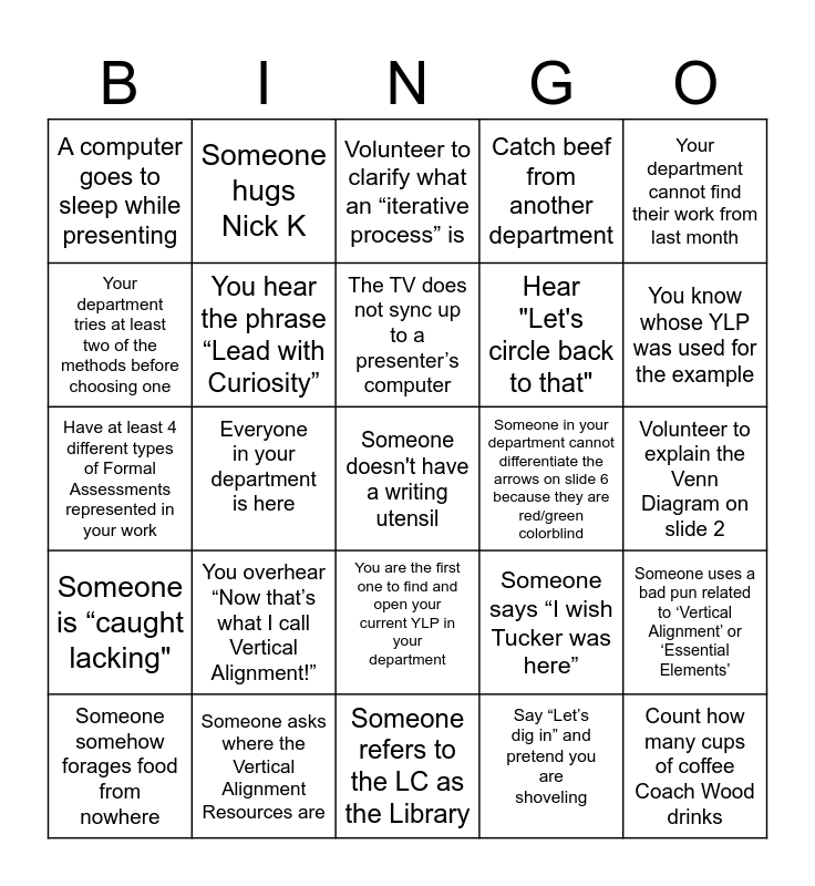 This bingo card has a free space and 24 words: You overhear “Now that’s what I call Vertical Alignment!”, Someone asks where the Vertical Alignment Resources are, The TV does not sync up to a presenter’s computer, Someone somehow forages food from nowhere, Your department cannot find their work from last month, A computer goes to sleep while presenting, Your department tries at least two of the methods before choosing one, Someone hugs Nick K, Someone in your department cannot differentiate the arrows on slide 6 because they are red/green colorblind, You are the first one to find and open your current YLP in your department, Hear "Let's circle back to that", Have at least 4 different types of Formal Assessments represented in your work, Someone says “I wish Tucker was here”, Someone uses a bad pun related to ‘Vertical Alignment’ or ‘Essential Elements’, You hear the phrase “Lead with Curiosity”, Say “Let’s dig in” and pretend you are shoveling, Volunteer to explain the Venn Diagram on slide 2, Volunteer to clarify what an “iterative process” is, You know whose YLP was used for the example, Everyone in your department is here, Count how many cups of coffee Coach Wood drinks, Someone is “caught lacking", Catch beef from another department and Someone refers to the LC as the Library.