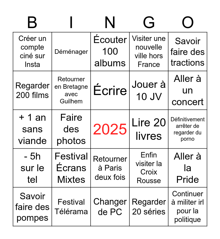 This bingo card has a free space and 24 words: Festival Écrans Mixtes, Festival Télérama, Écrire, Savoir faire des pompes, Savoir faire des tractions, Créer un compte ciné sur Insta, Regarder 200 films, Déménager, Lire 20 livres, Retourner à Paris deux fois, Jouer à 10 JV, + 1 an sans viande, Enfin visiter la Croix Rousse, Aller à la Pride, Retourner en Bretagne avec Guilhem, Regarder 20 séries, Définitivement arrêter de regarder du porno, Écouter 100 albums, Aller à un concert, Faire des photos, Continuer à militer irl pour la politique, - 5h sur le tel, Visiter une nouvelle ville hors France and Changer de PC.