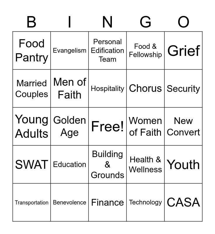 This bingo card has a free space and 24 words: Education, Benevolence, Hospitality, Transportation, Grief, Food Pantry, Married Couples, Evangelism, Women of Faith, Building & Grounds, Chorus, Young Adults, Health & Wellness, Youth, Men of Faith, Technology, New Convert, Personal Edification Team, Security, Golden Age, CASA, SWAT, Food & Fellowship and Finance.