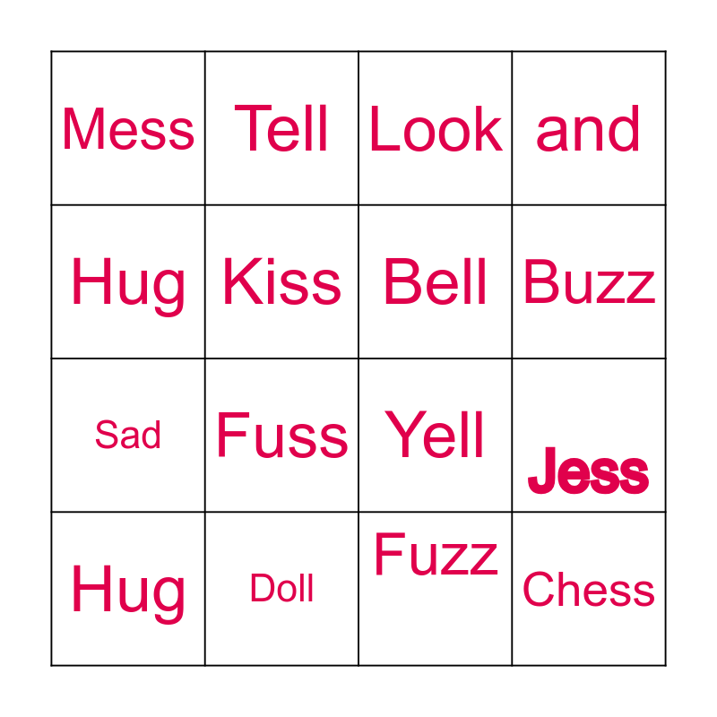 This bingo card has 16 words: Doll, Jess, Look, Mess, Sad, Tell, Yell, Fuzz, Hug, Kiss, Hug, and, Fuss, Buzz, Bell and Chess.