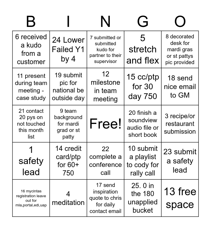 This bingo card has a free space and 25 words: 1 safety lead, 2 tell me something good, 3 recipe/or restaurant submission, 4 meditation, 5 stretch and flex, 6 received a kudo from a customer, 7 submitted or submitted kudo for partner to their supervisor, 8 decorated desk for mardi gras or st pattys pic provided, 9 team background for mardi grad or st patty, 10 submit a playlist to cody for rally call, 11 present during team meeting - case study, 12 milestone in team meeting, 13 free space, 14 credit card/ptp for 60+ 750, 15 cc/ptp for 30 day 750, 16 mycintas registration leave out for mla,portal,edi,uap, 17 send inspiration quote to chris for daily contact email, 18 send nice email to GM, 19 submit pic for national be outside day, 20 finish a soundview audio file or short book, 21 contact 20 pys on not touched this month list, 22 complete a conference call, 23 submit a safety lead, 24 Lower Failed Y1 by 4 and 25. 0 in the 180 unapplied bucket.