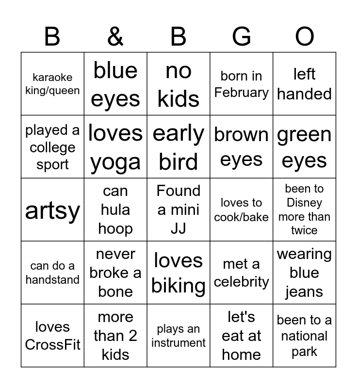 This bingo card has a free space and 39 words: speaks another language, loves to hike, loves to camp, loves yoga, loves CrossFit, loves biking, early bird, night owl, left handed, can do a handstand, can hula hoop, born in February, been to a national park, been to Disney more than twice, loves to cook/bake, never broke a bone, broken more than 1 bone, karaoke king/queen, coffee fanatic, met a celebrity, played a college sport, plays an instrument, brown eyes, green eyes, only child, middle child, youngest sibling, oldest sibling, has more than 2 siblings, blue eyes, cat person, dog person, no kids, more than 2 kids, let's eat at home, let's eat out, wearing blue jeans, artsy and concert junkie.