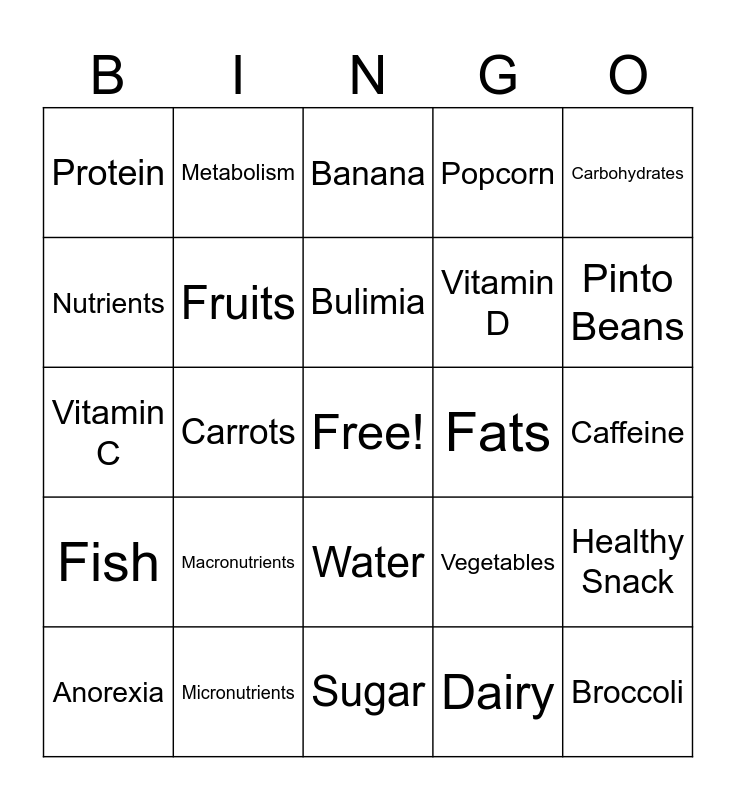 This bingo card has a free space and 24 words: Macronutrients, Micronutrients, Bulimia, Anorexia, Carbohydrates, Protein, Nutrients, Metabolism, Fats, Water, Vitamin D, Vitamin C, Vegetables, Healthy Snack, Fruits, Dairy, Caffeine, Banana, Pinto Beans, Carrots, Broccoli, Fish, Popcorn and Sugar.